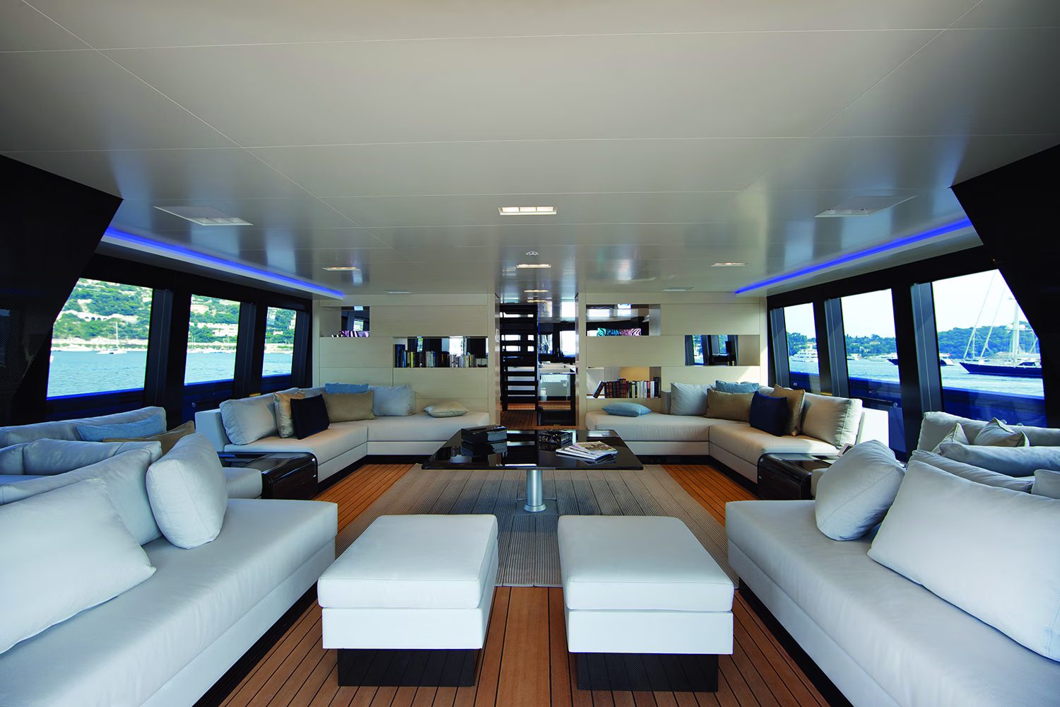 To enhance the Wally inside-outside living concept, a 360° transparent glass encloses the deckhouse providing the guests with the view and open-air feeling when they are in the salon. The deckhouse encloses the main salon aft and dining area forward; and a twin navigation stations at the forward end. All the living spaces are characterised by the open space loft and flexibility concept to change configurations according to the use and requirements of different moments.