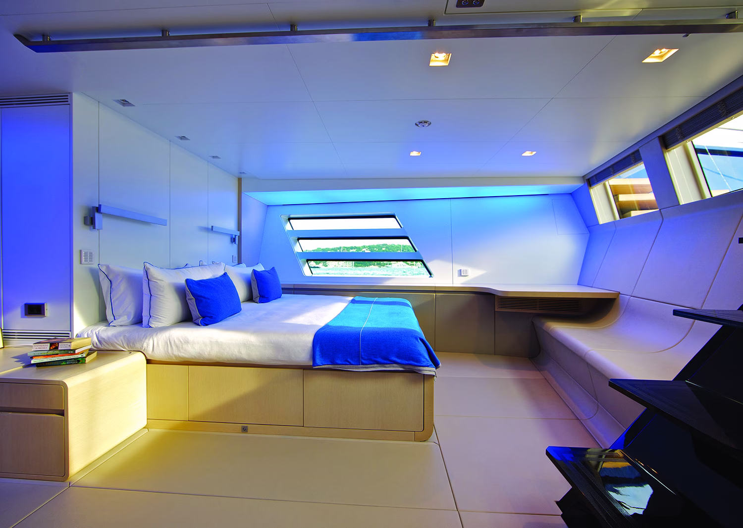To improve even further the performance, she will feature PBO rigging, the water tanks will be used as water ballast as well, and the lifting keel increasing the draft to 6 m when sailing, from 4.2 meter when motoring, anchoring and entering ports. As a result, this Mega Sailer features a light displacement (only 250 tons) combined with the accommodation and comforts of a yacht of this size.