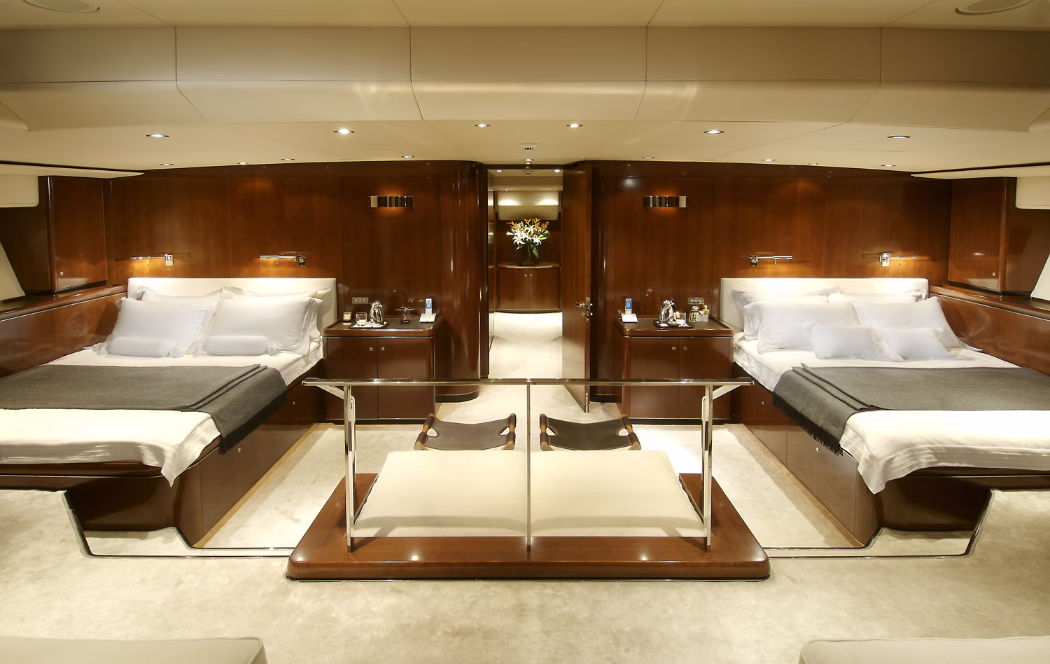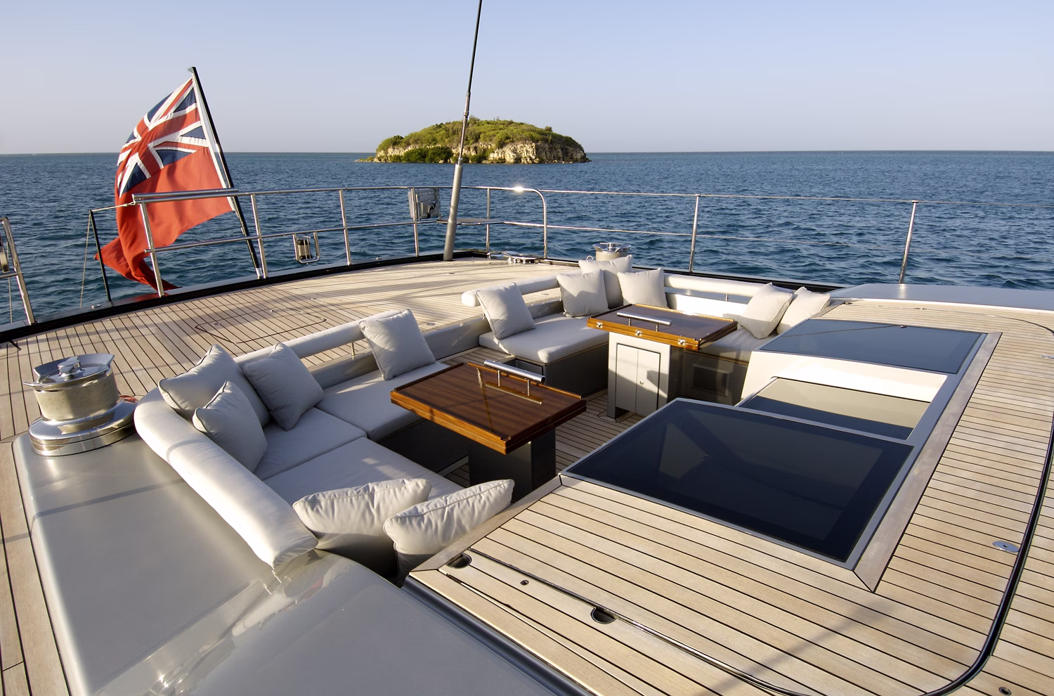 The exterior is a low pilothouse on a flush deck with hidden captive winches, and under-deck leads for safety and uncluttered walkways. The cockpit is sunk below deck level, inside a coaming, affording protection, yet a clear sightline from the wheel to the bow over the deckhouse. A separate owner’s cockpit aft acts as the private terrace leading to the owner’s suite. The interior is by Dick Young in a clean but warm style, featuring a large pilothouse salon, and accommodations for seven guests with a crew of six.