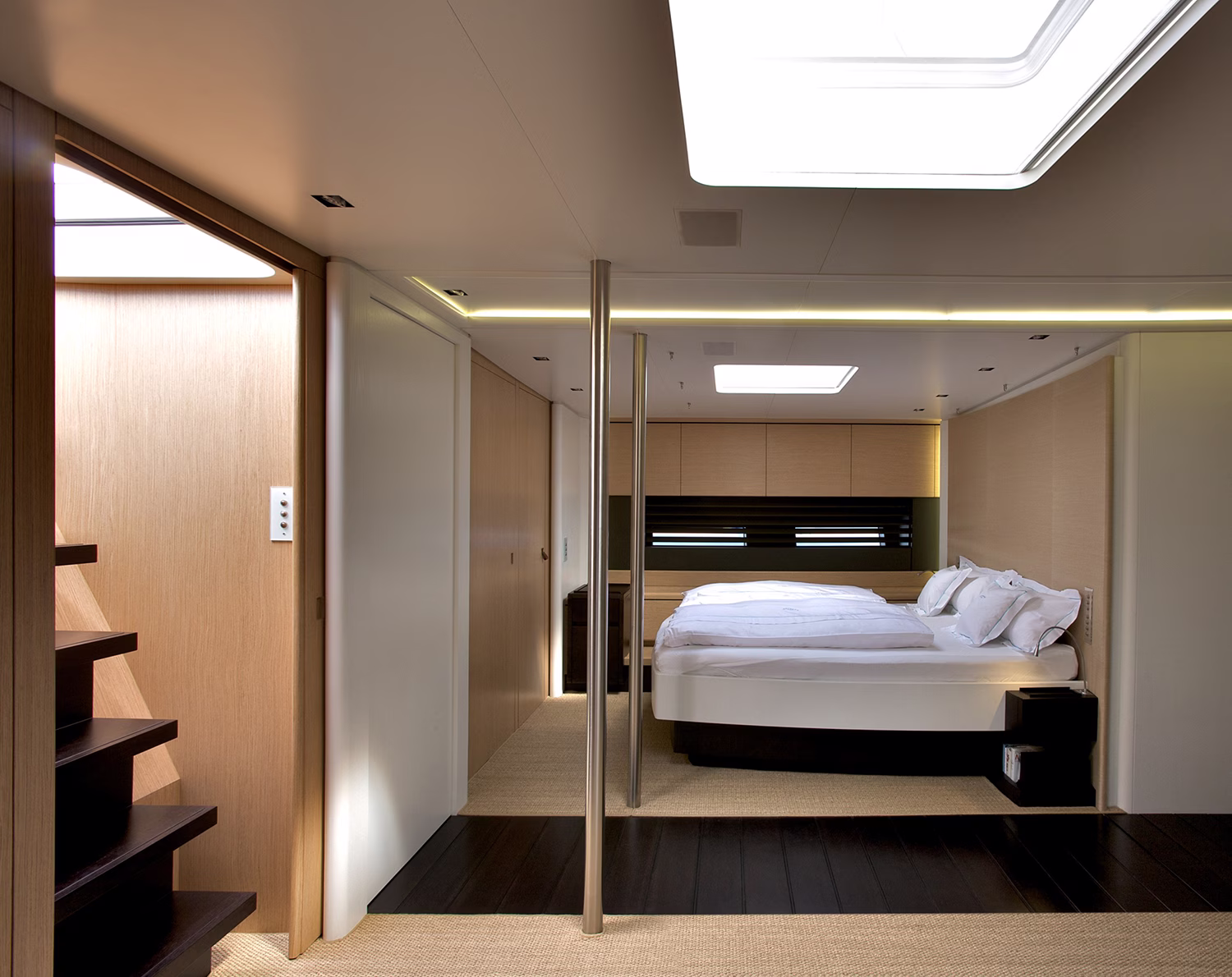 Saudade’s exterior styling was a collaboration between Tripp Design and Eidsgaard Design with an immaculate interior design by Eidsgaard Design. Saudade’s low and aggressive pilothouse, perfectly in balance with her sleek hull line, provides the helmsman a commanding view. From her expansive ‘shaded’ cockpit one enters the main salon through a wide sliding cockpit door, providing an uninterrupted connection between these two spaces and a real feeling of inside/outside living. The interior living areas are flooded with natural light using ceiling hatches and large deckhouse windows. Floor levels and seating were positioned for the benefit of the guests, providing views to the horizon-line from the interior, an unusual feature for sailing yachts of this size.