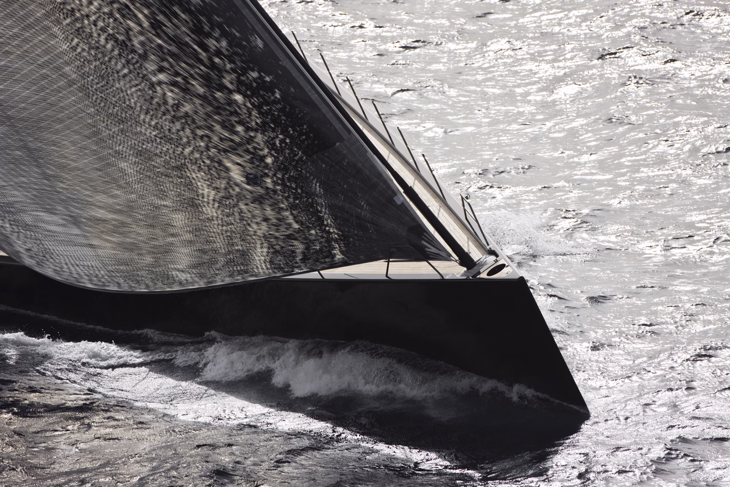This was Tripp Design’s second collaboration with Wally and all efforts were made to achieve ultimate speed within the constraints of seamanship. To best resolve the technical difficulties that a blue-water cruising superyacht poses, full use was made of state-of-the-art construction and technology. Saudade’s project manager Jens Cornelsen writes, “Displacing a mere 150 tons, Saudade is fabricated in advanced pre-preg carbon composites. To meet the globetrotting needs of her very experienced owners, the Tripp office designed a displacement / length ratio of only 71, and combined this with a fully ballasted lifting keel (6.2 to 4.2 meters.) The simple result: speed and plenty of it, at all points of sail and in the lightest of winds. “