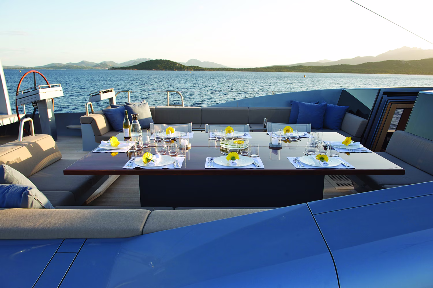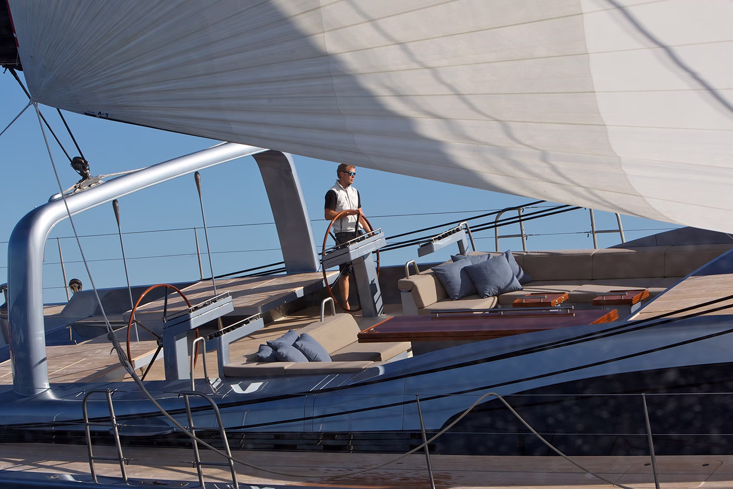 Sharlou’s original owners were very involved with the design of the boat from the interior layout to the exterior sightlines, with a strong emphasis on a clean and modern look. The boat is designed for adventure: spear fishing in the Pacific, racing to Hobart, and exploring remote parts of the world. Design objectives focused on the different ways the boat was to be used during month-long stays on board. To this end, the aft cockpit can be transformed into a swimming pool for the kids if sharks patrol the surrounding waters. The main sheet has been placed on an arch spanning the cockpit to keep the deck clear for children. The coamings sweep around the superstructure giving a design base as well as good protection from the environment.