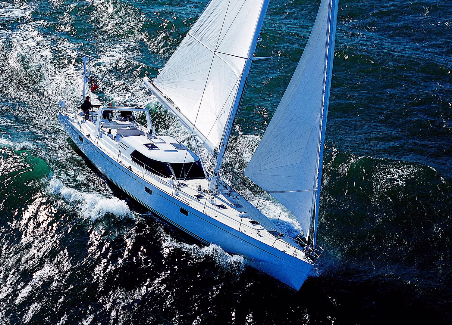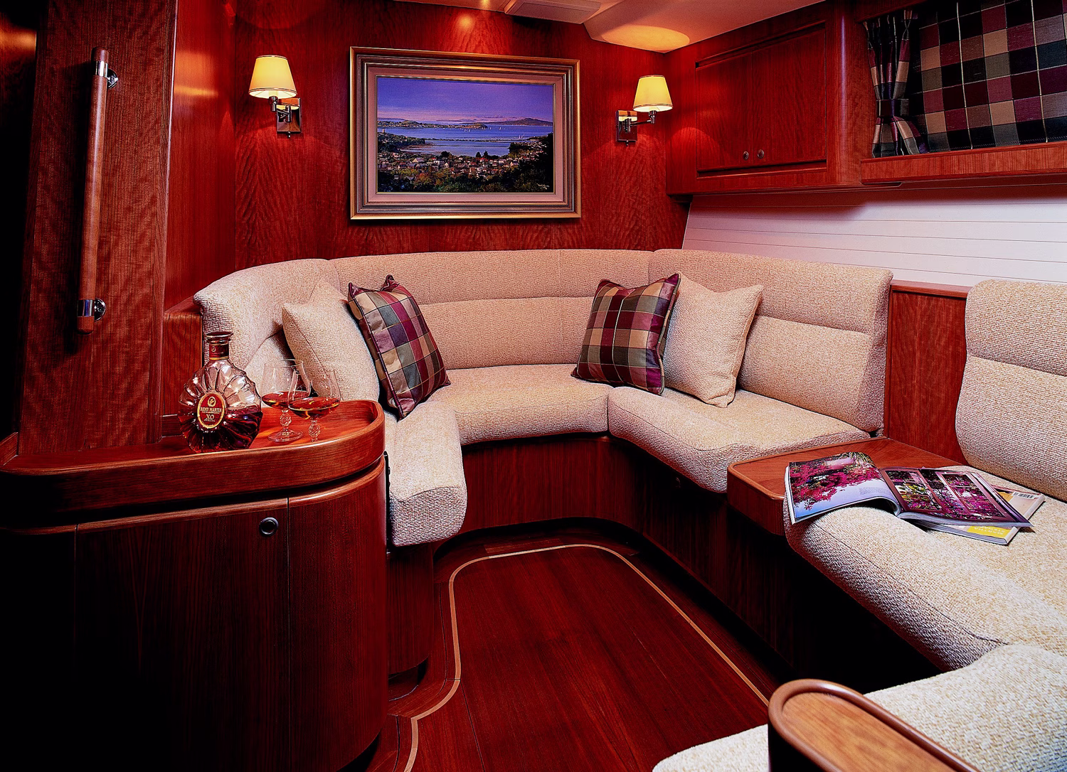 The raised pilot/salon area allows for sailing the boat in uncomfortable conditions in a comfortable environment, with inside lounging and steering areas. Immediately aft of the pilothouse is the cockpit sheltered by the pilothouse and surrounded by dual coamings. The pilothouse gives the inside space of the boat visual access to the cruising grounds, and lapping the house glass over the lower salon draws the lower deck into the upper areas of the boat.