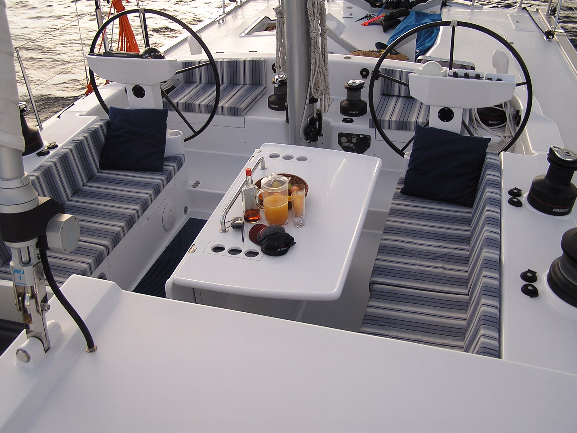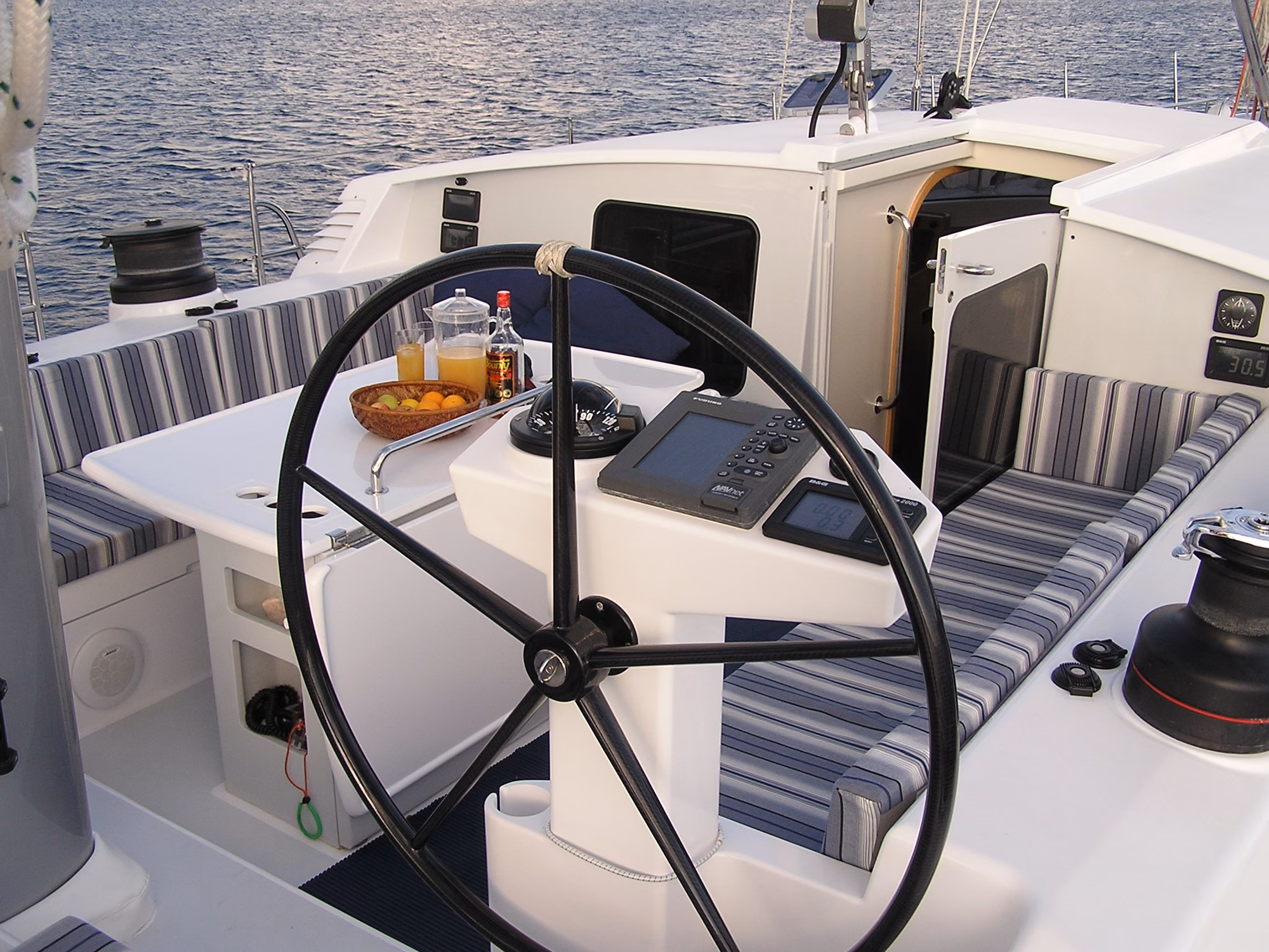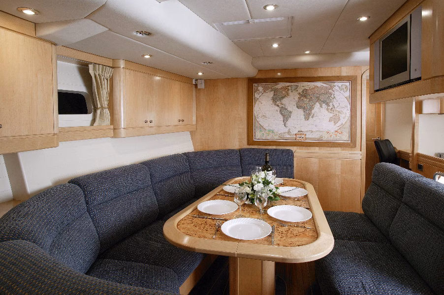 With a fully cored Kevlar/E-glass construction LADY K is light displacement, but has maximal impact strength. She also has many features to support distance sailing and easy handling by a small crew, including a well protected cockpit with shelter behind the raised pilot house. All winches, furlers and sail functions can be controlled from the cockpit and the boat can also be handled from the inside steering station.